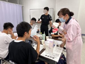 生徒の皆さんはとても意欲的で、染め出しで磨き残しを発見すると「もっときれいにしたい!」と積極的に歯みがきに取り組む姿も見られました。