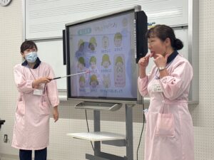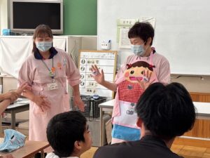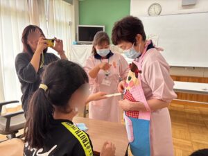 翌日は中学2年生を中心とした生徒さんを対象に指導を行いました。内容は埼玉大学教育学部附属特別支援学校と共通で、RDテスト・染め出し・ブラッシング指導を行いましたが、対象年齢がやや低いことから、導入にパワーポイントでの指導とエプロンシアターでの指導も取り入れ、視覚的に分かりやすく楽しめる工夫を加えました。