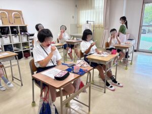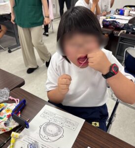 あいうべー体操やピロピロ笛で表情筋のトレーニングも。口呼吸を防ぎ、鼻呼吸を意識する大切さも一緒に伝えました。