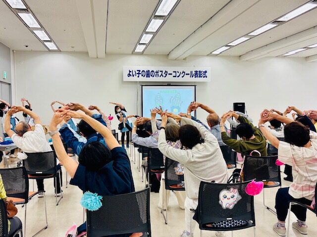 「8020よい歯のコンクール」では、80歳で20本の歯がある方30名が表彰され、その後お口の健康体操をおこないました。皆さん一生懸命、パタカラ体操や吹き戻しに取組んでいました。