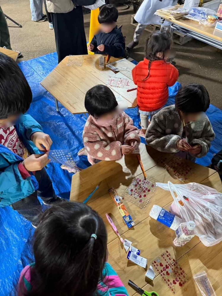 飲み物に含まれる糖分量の媒体(朝霞支部学校歯科保健指導用媒体)の展示、配布歯ブラシに自分でシールを使いデコレーション、食事を待つ間・食後に口腔衛生指導を行いました。当日は小雪舞う厳しい寒さでしたが120人を超える方々のご参加がありました。
