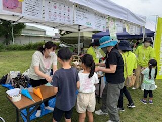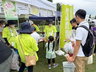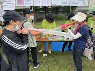 埼玉県歯科衛生士会では各支部が交代でウォーキングを続けながら、参加した他団体・来場者に向けて口腔衛生に関するリーフレットや歯ブラシ・デンタルフロス等を配布したり、傘入れのビニール袋とストロー・画用紙を使い手作りのピロピロ笛を参加者の皆さんと作成しました。