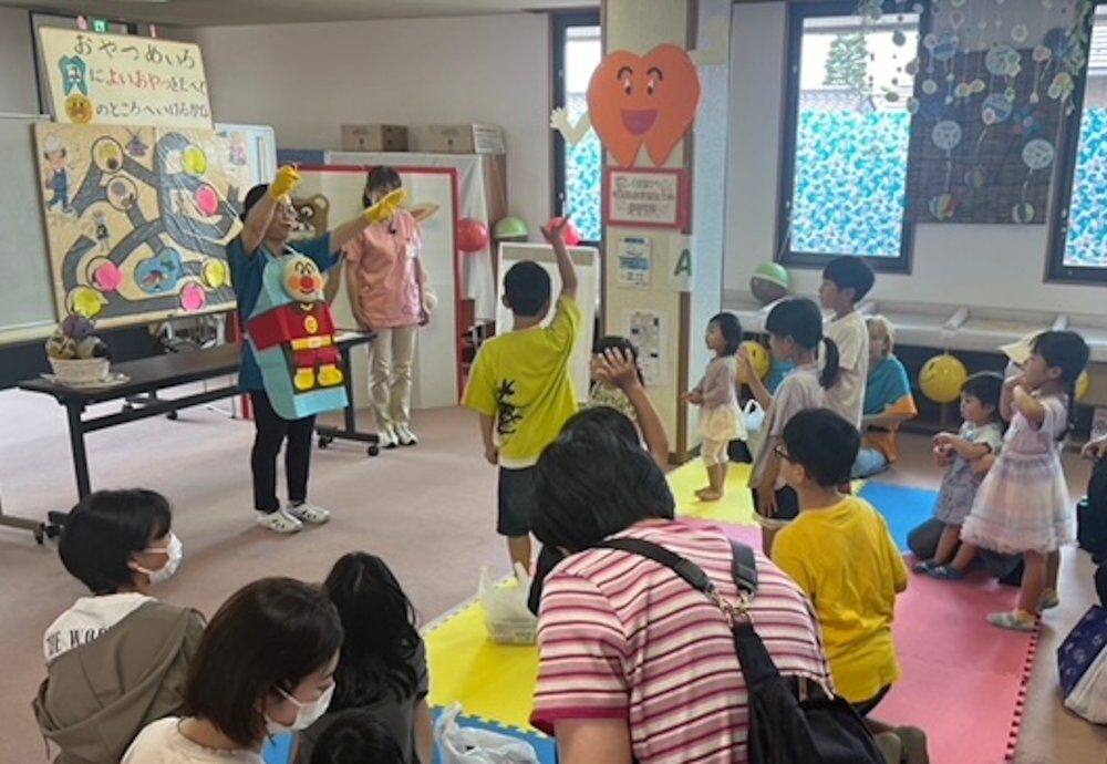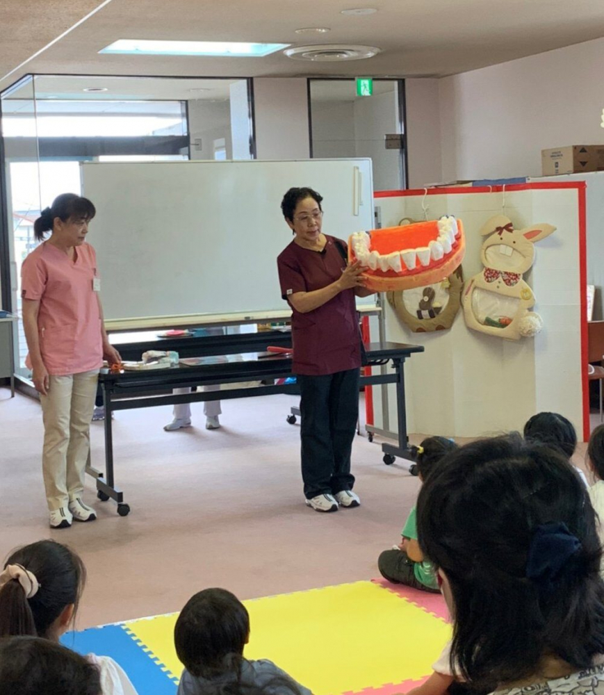 歯科衛生士会では➀おやつ迷路②むし歯予防のお話とフッ化物利用について③口腔機能向上あいうべ体操④紙フーセンを使ったゲーム等 の内容で多くの親子と触れ合いながら楽しい時間を過ごすことができました。