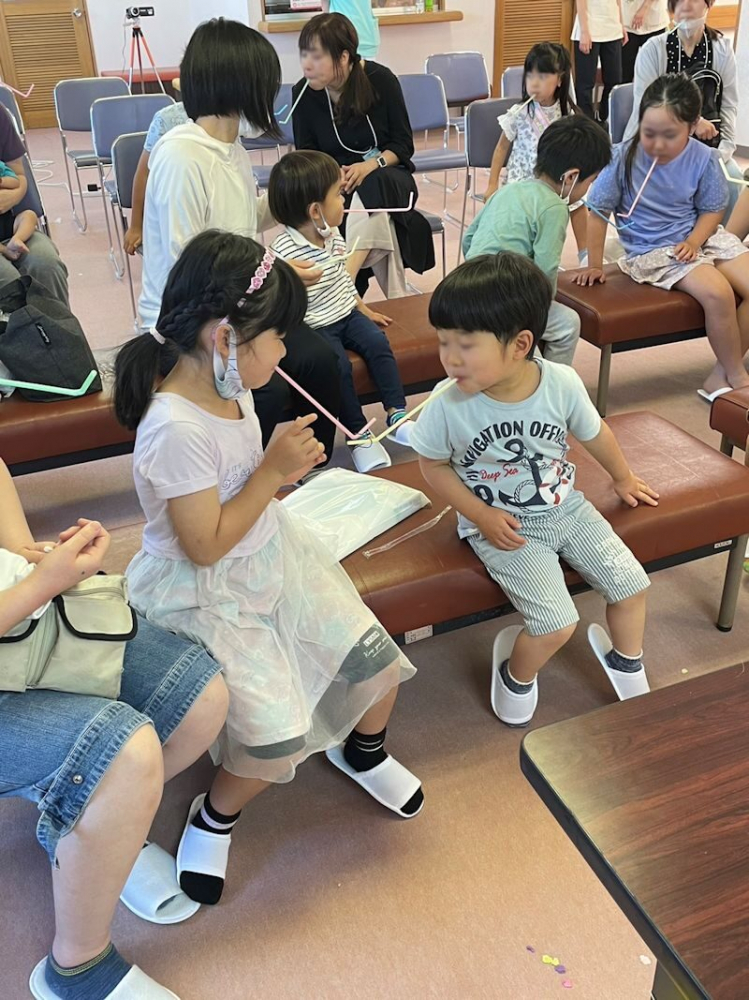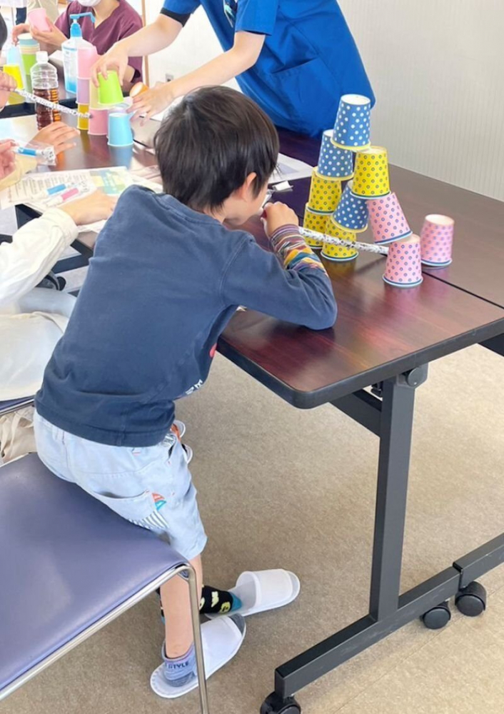 歯科医師会では、口唇閉鎖力測定器「りっぷるくん」を使って口腔機能検査したり「吹き戻し」を使ったコップタワー崩しなども体験できました。