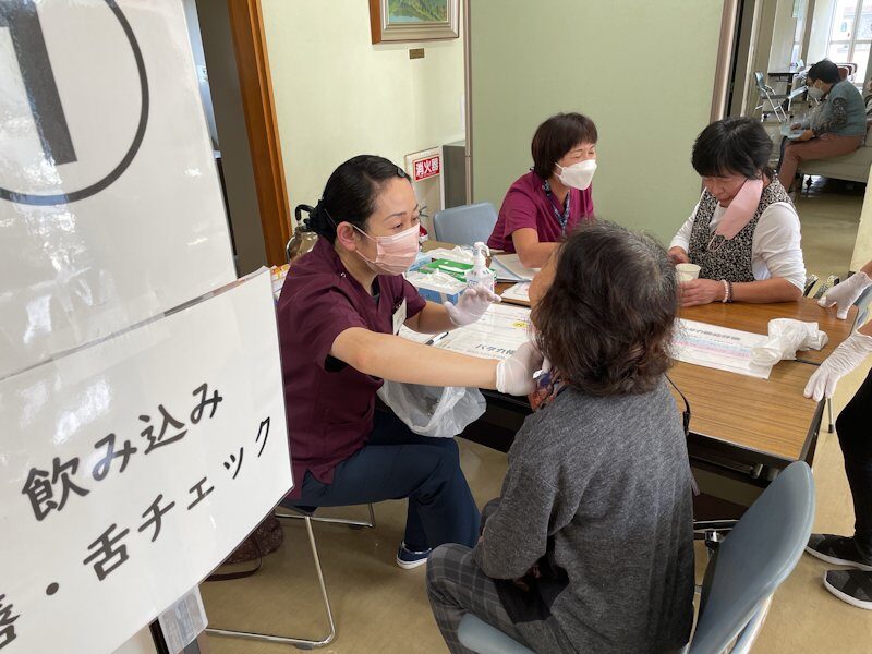 「健康相談会」では、口腔機能、栄養状態、運動機能のフレイル予防対策として各職能団体(歯科医師、歯科衛生士、管理栄養士、理学療法士、薬剤師)がアドバイザーになり個別相談を行いました。歯科医師による口腔診査及び相談、歯科衛生士による機能チェック(RSST、パタカ測定)・個別相談を行いました。口腔から栄養、運動、服薬に対しての個別指導へと繋げることも出来ました。参加者の皆さまは多方面から適切な説明が受けられ大変満足されていました。