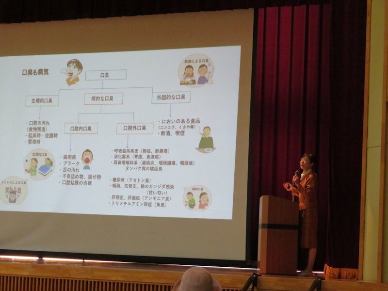 東松山市社会福祉協議会の介護予防事業では、概ね65歳以上を対象とし、年に1回講演会を開催しています。本年度は「口腔」をテーマに歯周病予防や口腔のフレイル予防についての内容を本会の大久保喜惠子会長が講演いたしました。