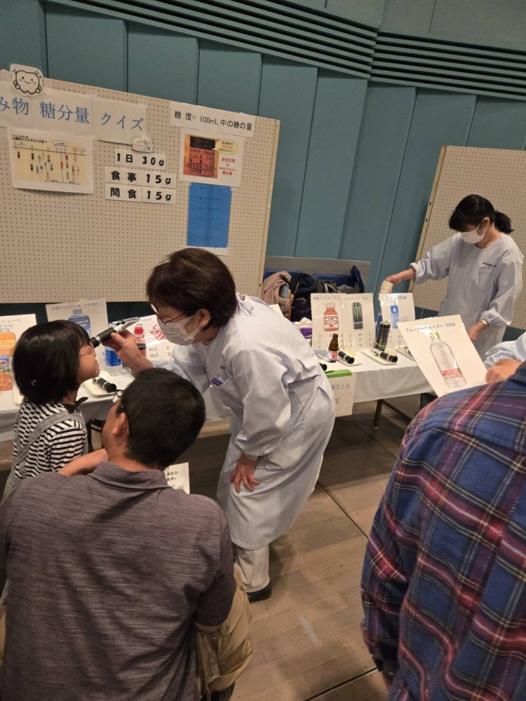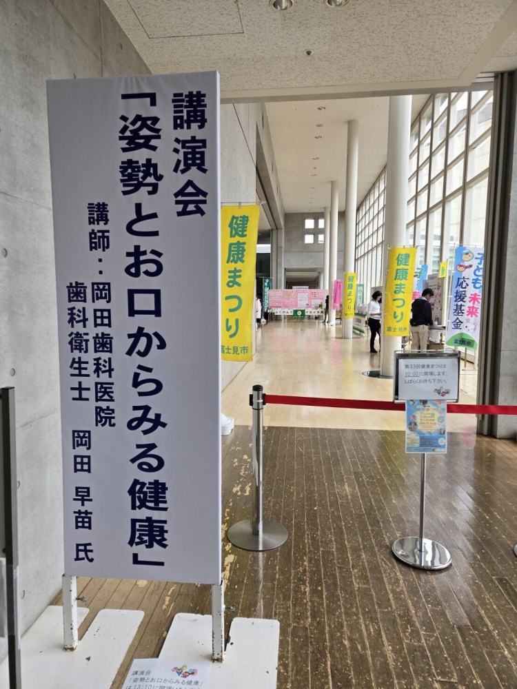 富士見市健康まつり実行委員会構成団体主催の第33回健康まつりが開催され、健康に役立つ情報やパネル展示などが行われるなか、歯科衛生士会朝霞支部では歯科衛生士ブースにおいてリーフレット配布・飲み物の糖分量クイズ・参加者への歯ブラシの配布などを担当しました。約300名の来場者があり、歯科を通じての全身の健康の関心の深さを感じました。午後には岡田早苗氏(岡田歯科医院歯科衛生士)による「姿勢とお口から見る健康」と題した講演会も行われました。