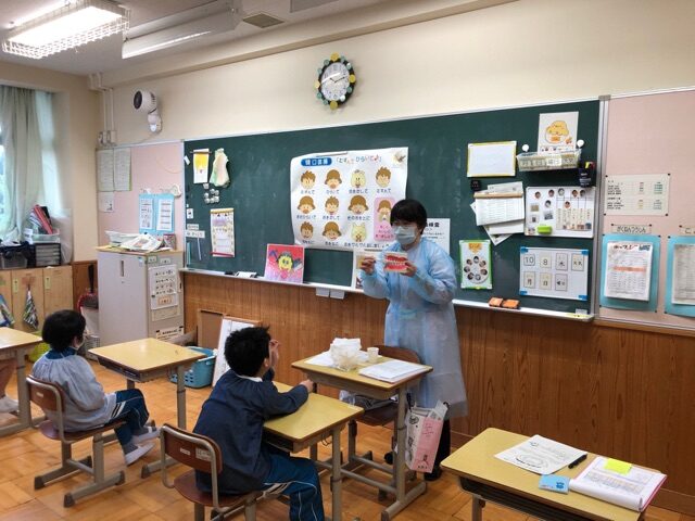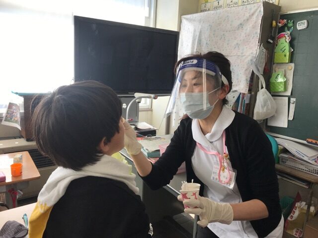 通常通り、パネルシアター、歯垢染色、口腔内に歯ブラシを入れての歯みがき、RDテスト、口腔体操を行った学校では、歯垢染色時には、マスク、フェイスシールドに加え、サージカルガウンを着用しました。しかし、その姿を怖がってしまった児童もいたため、今後の課題となりました。