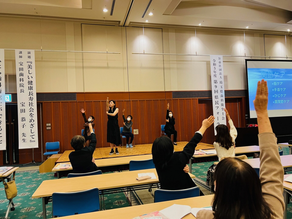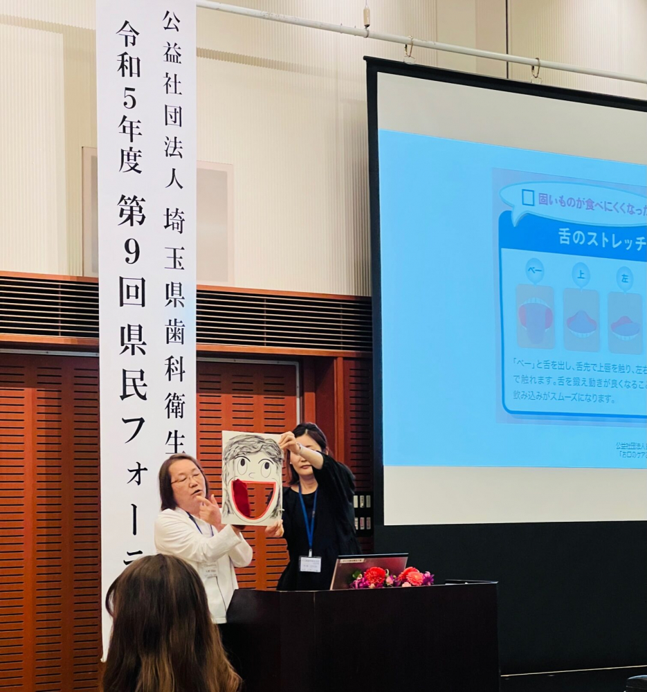 会場の皆さんと一緒にお口の運動を行なったりして、お口の機能の維持の重要性を強調されていました。また、セルフケアとプロフェッショナルケアに加えて、パブリックヘルスケアの重要性についても言及され、この三つのケアが重なってこそ、元気なお口の健康へと繋がるということを話されました。