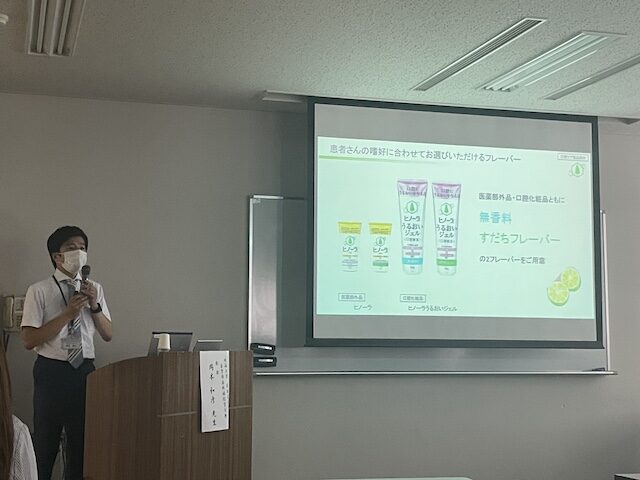 次に、株式会社大塚製薬工場の係長である冨尾勇介様よりヒノーラとヒノーラうるおいジェルの商品プレゼンテーションがありました。薬用成分「ヒノキチオール」が配合され抗菌・抗炎症作用がある保湿剤でなので、先生の講演後に質問があったように口角が荒れてしまう方などに是非勧めたいと思いました。