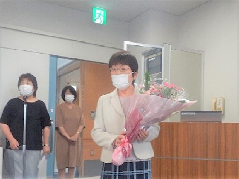 総会終了後、長きにわたって埼玉県歯科衛生士会事務所の職員として勤務くださり、会を陰ながら支えてくださった栗山さんが6月末で退職されることが紹介されました。大久保会長より花束贈呈があり、会場は感謝の拍手に包まれました。